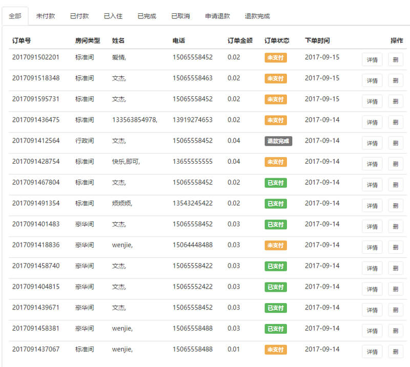 后台支持一键入住,一键退款、退押金、钟点房。支持微信支付、模板消息。客服实时收到新的订单信息,可以在手机端处理订单,支持按日期维护房价和房间数量,支持到店付款。支持积分功能,完成订房后获得的积分可以兑换代金券或优惠券,支持无线打印机和短信,评价打分功能,会员等级功能,二维码核销,积分或特产商城,会员充值(开发中)。